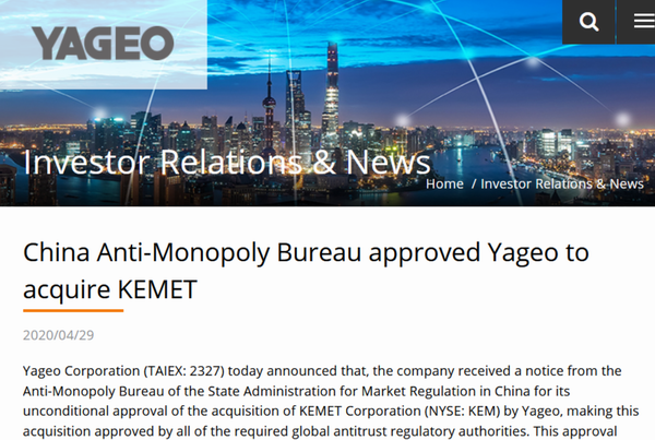您现在的位置:首页 > 行业资讯4月29,国巨(Yageo)官宣已收到中国大陆反垄断局正式核准国巨与美国基美(KEMET)合并案的通知。如今,获得中国台湾地区的投审委员会的审查通过后,意味着该并购案的最后反垄断审查流程已经顺利完成 ,交易将如期在今年第三季度完成。
