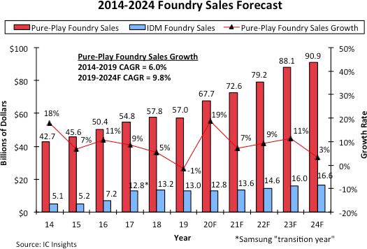 机构预计到2020年纯晶圆代工占代工总销售额的81.4%,低于2014年的89.3%。从2019年到2024年,纯晶圆代工的复合年增长率(CAGR)预计为9.8% ,比2014年2019年的6.0%复合年增长率高出3.8个百分点,并且超过了同一预测期内整个IC市场预期7.3%的复合年增长率。