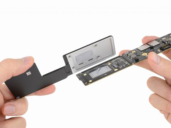 MacBook Air 采用更长的铝金属散热片来替处理器散热,主要是依赖传导热量技术,将热能导到另一边比较凉的区块散热,这种设计带来优势在于降低损坏,偶尔可能要换散热膏。不过iFixit还是对于MacBook Air无风扇设计表示了担忧,这种散热方案可能会让机身的散热时间延长很多,持续输出高性能的稳定性会是个隐患。