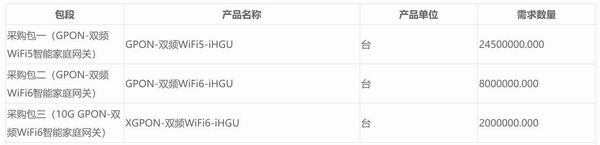 12月15日,中国移动官网发布2020年至2021年智能家庭网关产品集中采购(公开部分),项目分为3个采购包,计划采购GPON-双频WiFi 5智能家庭网关2450万台,GPON-双频WiFi 6家庭网关800万台和10G GPON-双频WiFi 6智能家庭网关200万台,需求数量合计3450万台。