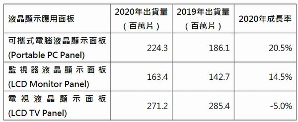 2020年各应用大尺寸液晶显示面板,包括电脑液晶显示面板(Portable PC Panel)、液晶显示器面板(LCD Monitor Panel)、电视液晶显示面板(LCD TV Panel),出货量明显成长,成长率达7.28%,总量高达658.9百万片,创过去十年以来的最高纪录...
