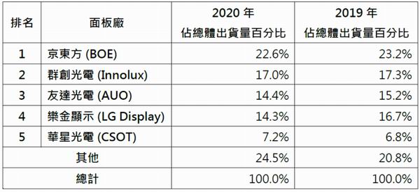 2020年大尺寸液晶显示前五大面板厂出货占总体出货75.5%,厂商间的态势略有改变,华星光电(CSOT)在10.5代产能开出,同时迈入可携式电脑液晶显示面板与液晶显示器面板市场,出货排名提升至第五位达6.8%。其次友达光电(AUO)受惠于强劲IT面板需求以及韩厂减产,出货占比亦有所提升达14.4%。京东方(BOE)与群创光电(Innolux)仍持续占据第一名与第二名位置,市占率分别为22.6%与17.0%。