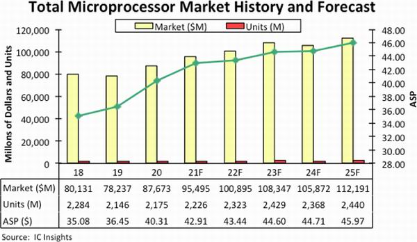 上图显示了计算机CPU处理器(按美元数量计算是最大的MPU类别)的销售额在最近五个年度中增长了20%。