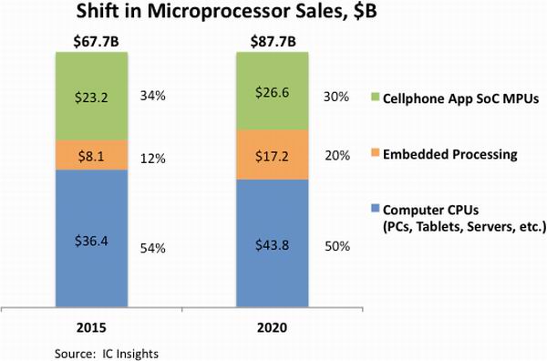 在过去的五年中,增长最快的微处理器市场类别是嵌入式处理器,在2015年至2020年之间的销售额增长了114%。