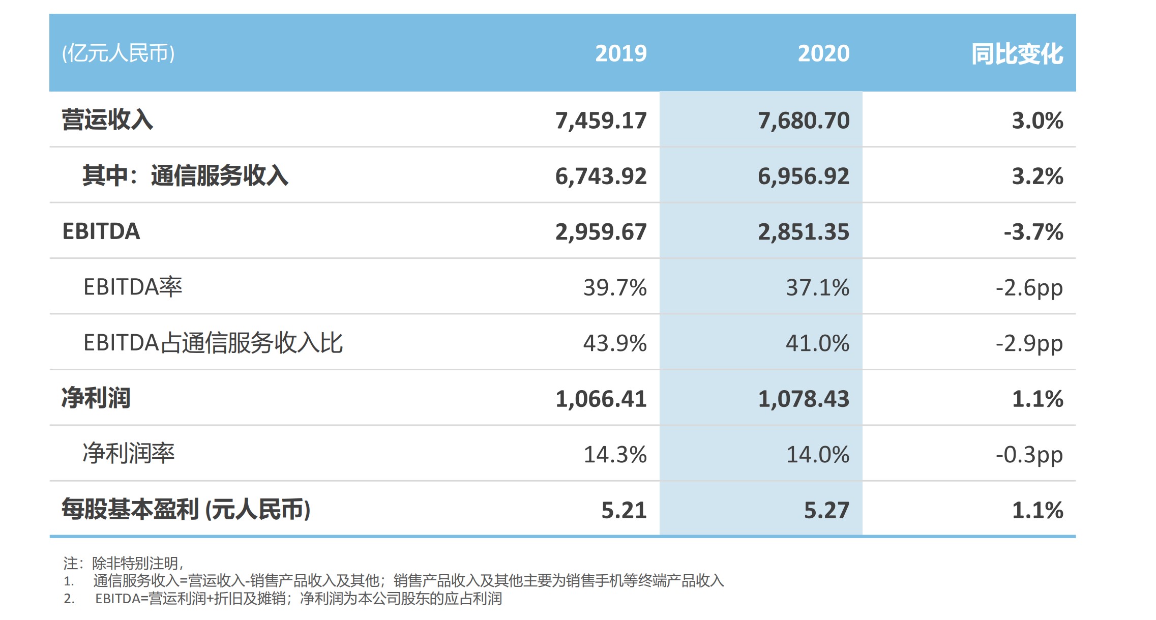 您现在的位置:首页 > 行业资讯中国移动今日发布2020年年度业绩报告,报告显示,2020年中国移动营运收入为人民币7681亿元,同比增长3.0%。其中,通信服务收入为人民币6957亿元,同比增长3.2%,增速较前两年显著提升,呈现良好的发展势头。净利润1078亿元,同比增长1.1%,扭转了2019年净利润下滑的趋势,实现了平稳增长。